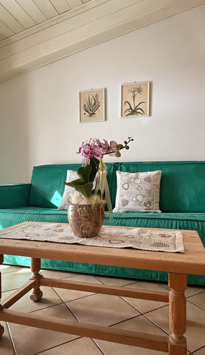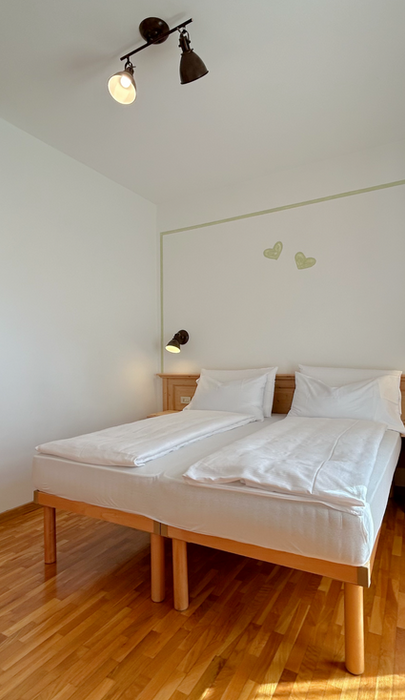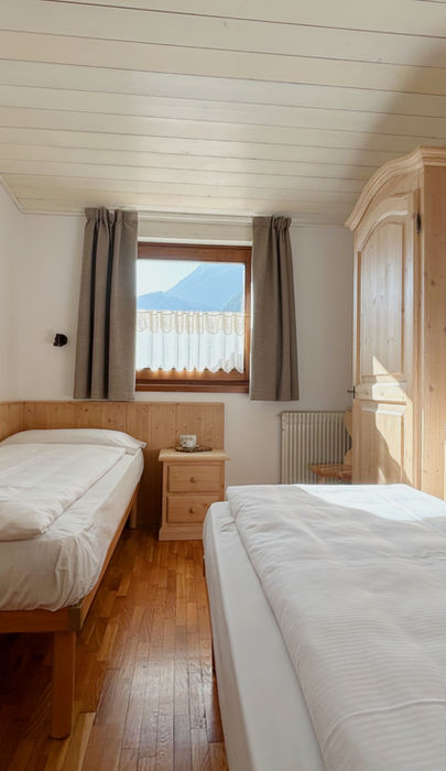 Die Enzianwohnung besteht aus drei Haupträumen. Das rustikale Design, unterstrichen durch edles Holz und natürliche Oberflächen, schafft eine warme und gemütliche Atmosphäre.Die Wohnung verfügt über ein Schlafzimmer mit Doppelbett, ein Einzelzimmer mit zwei Betten und ein geräumiges Wohnzimmer mit integrierter Küchenzeile. All dies ist von einem spektakulären Blick auf den Molvenosee, die Brenta-Dolomiten und den Gipfel der Paganella umgeben.