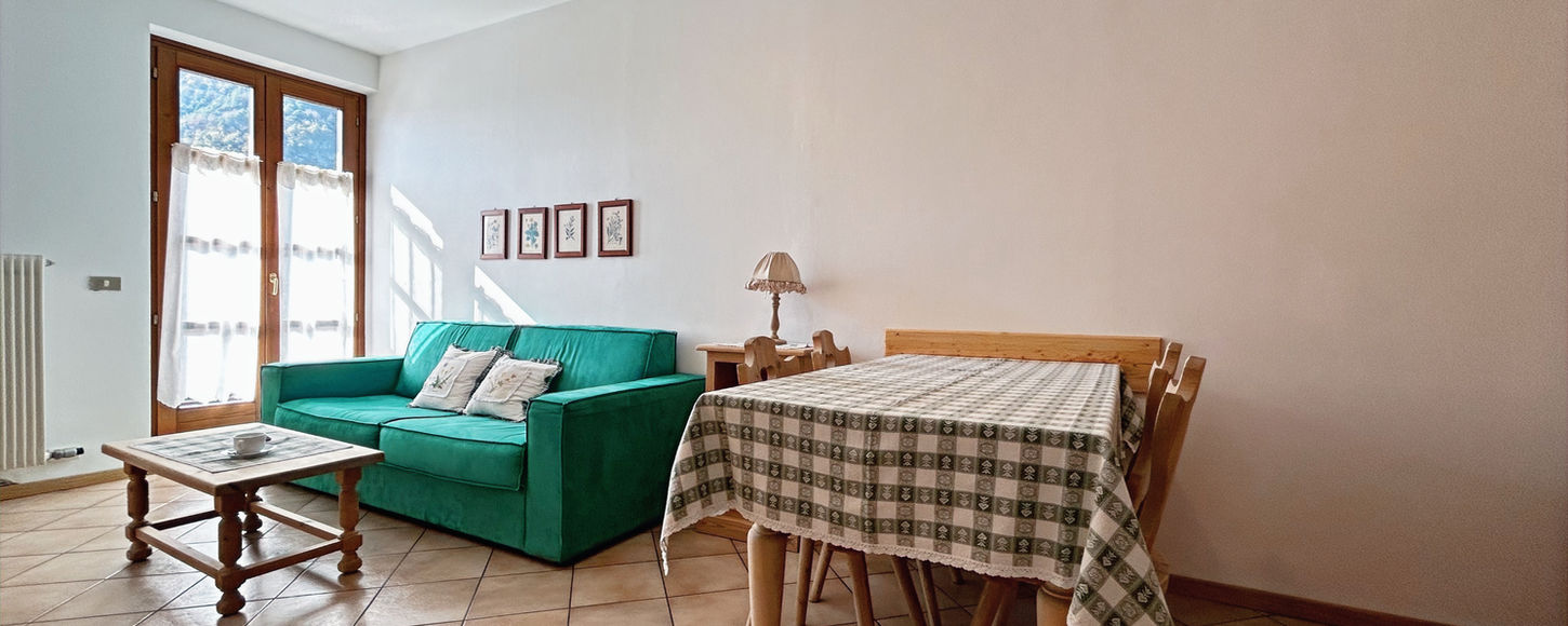 Die Wohnung verfügt über ein Schlafzimmer mit Doppelbett, ein Einzelzimmer mit zwei Betten und ein geräumiges Wohnzimmer mit integrierter Küchenzeile. All dies ist von einem spektakulären Blick auf den Molvenosee, die Brenta-Dolomiten und den Gipfel der Paganella umgeben.
